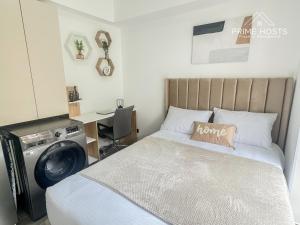 The apartment includes one bedroom with a feather pillow on the bed and a flat-screen TV for entertainment. The fully equipped kitchen contains a microwave, refrigerator, washing machine, kitchenware, and refrigerator in the sleeping area. Guests can enjoy meals or relax on the balcony that serves as an outdoor dining area.