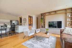 The spacious apartment offers three bedrooms and three bathrooms equipped with either a bath or shower. Guests can prepare meals in the fully equipped kitchen with an oven, microwave, refrigerator, and coffee machine. The living area contains a dining space and seating area alongside a flat-screen TV with cable channels. Additional conveniences include a washing machine, iron, hairdryer, desk, wardrobe, dressing room for changing clothes, towels and bed linens.